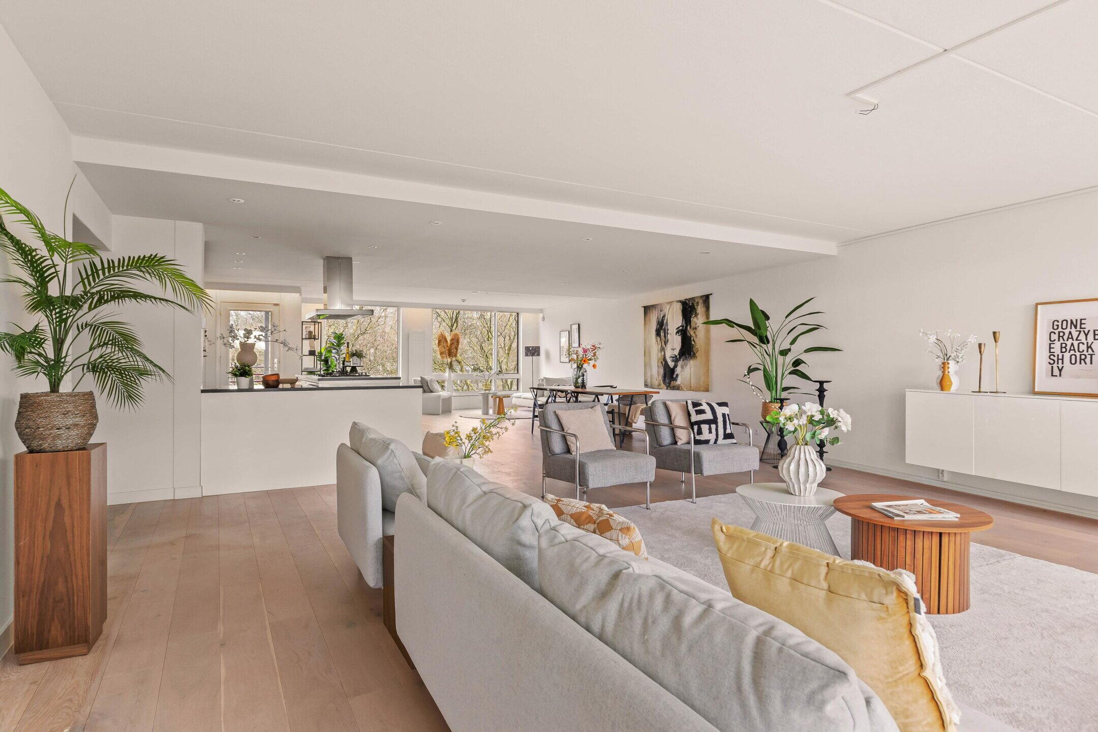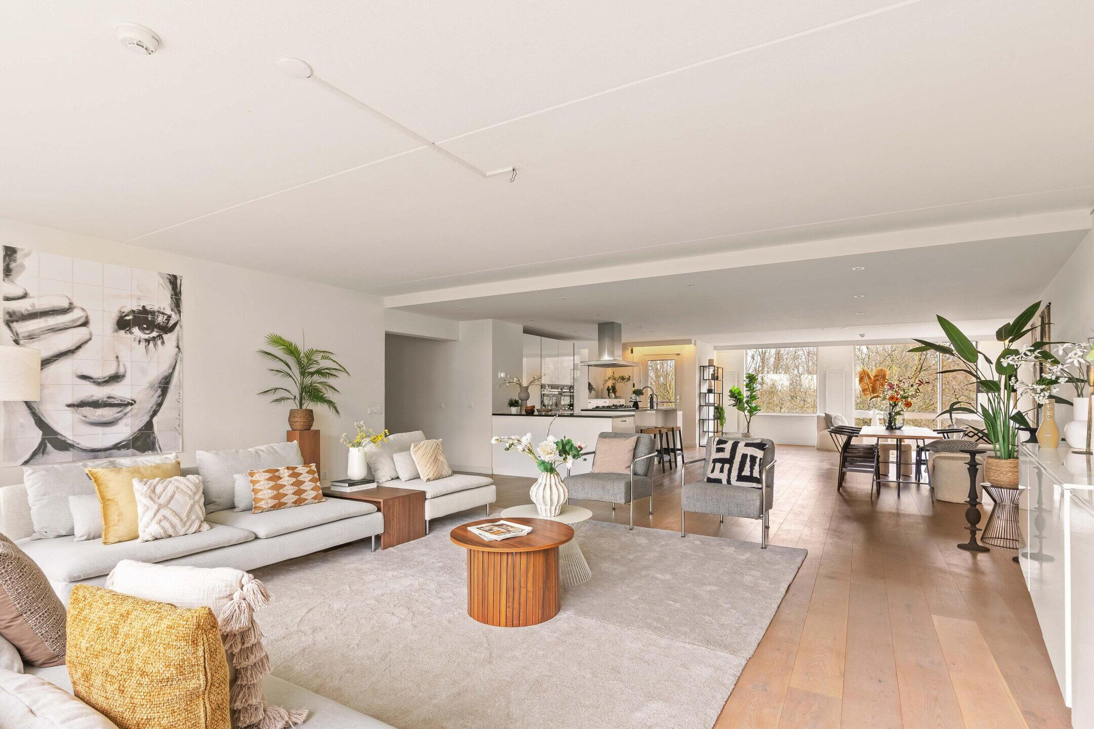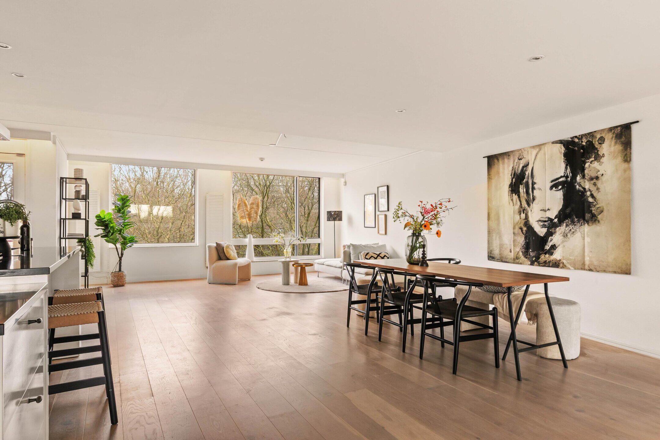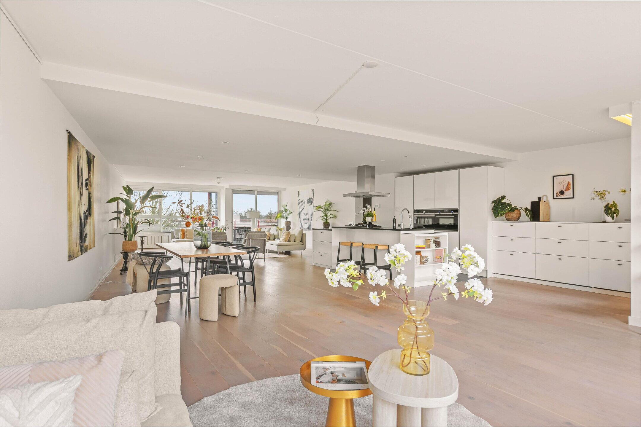 De indrukwekkende living strekt zich uit over de volledige breedte van het appartement en wordt gekenmerkt door grote raampartijen die zorgen voor een prachtige lichtinval en vrij uitzicht over het omliggende groen. De ruimte is royaal genoeg voor een comfortabele zithoek én een grote eettafel. Centraal in de leefruimte bevindt zich de moderne, U-vormige woonkeuken met kookeiland en gezellige ontbijtbar. De keuken is voorzien van diverse inbouwapparatuur (w.o. Quooker, vaatwasser en oven) en beschikt over meer dan voldoende opbergruimte.