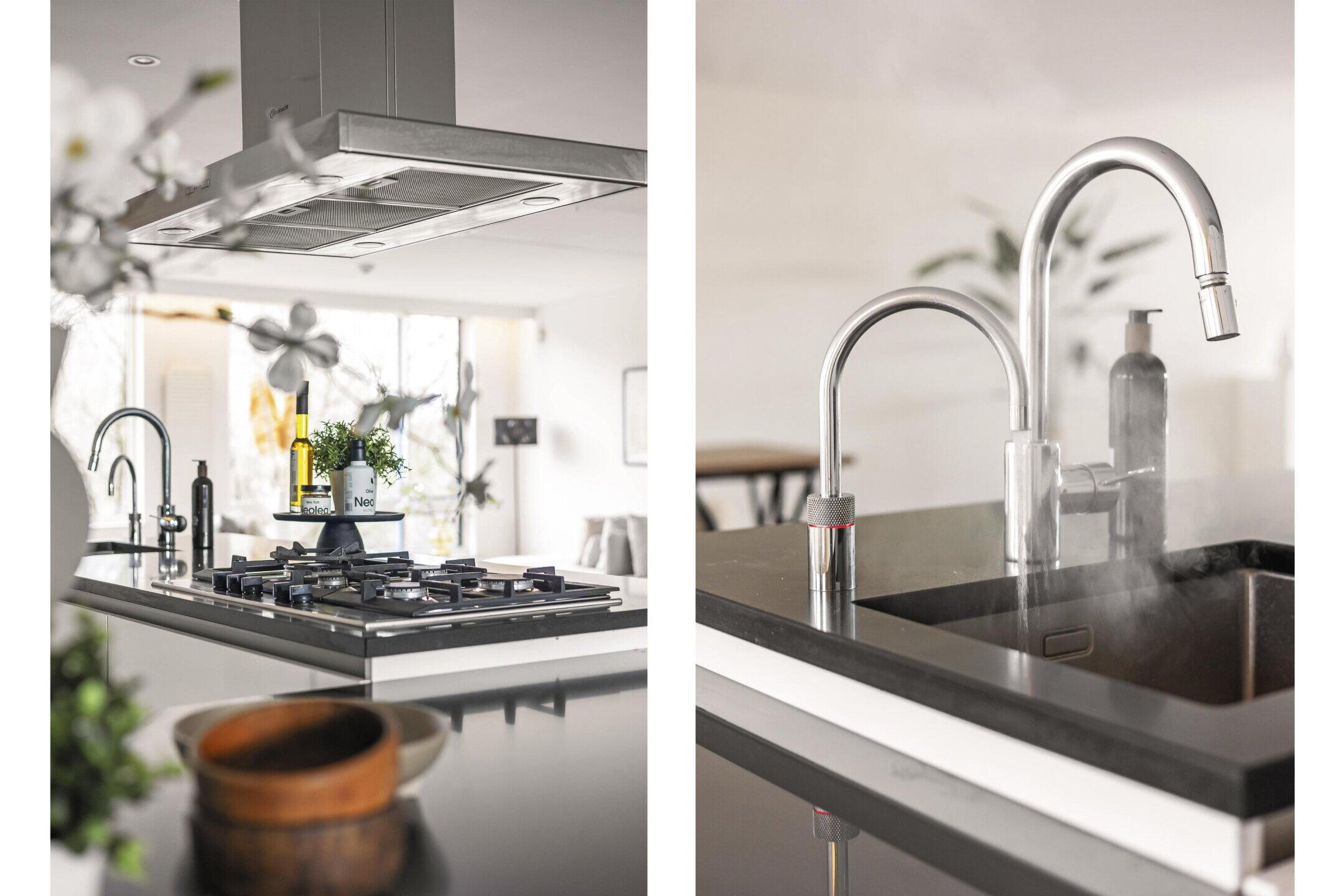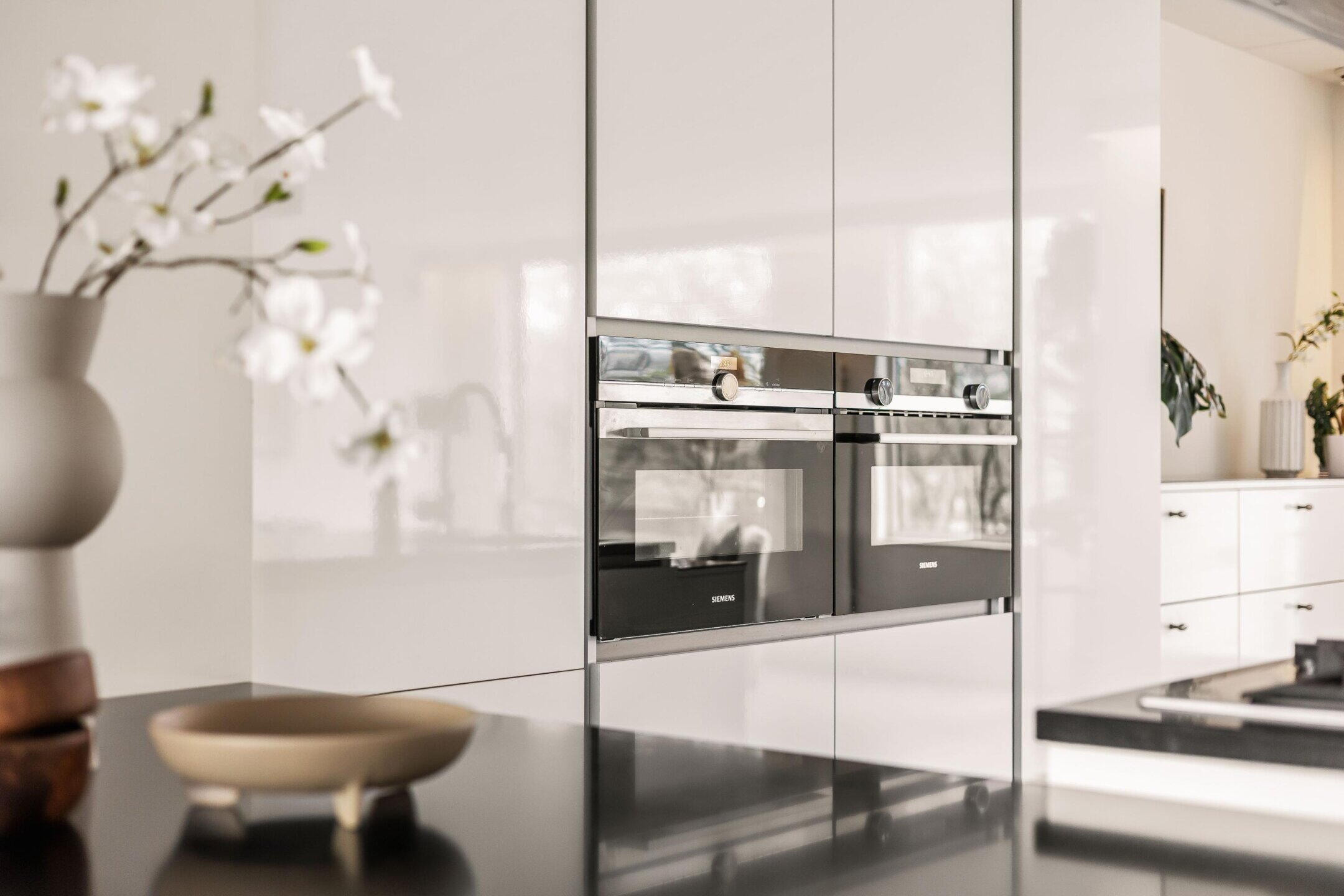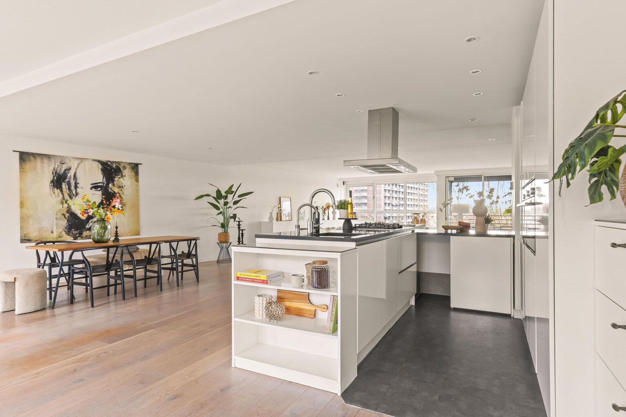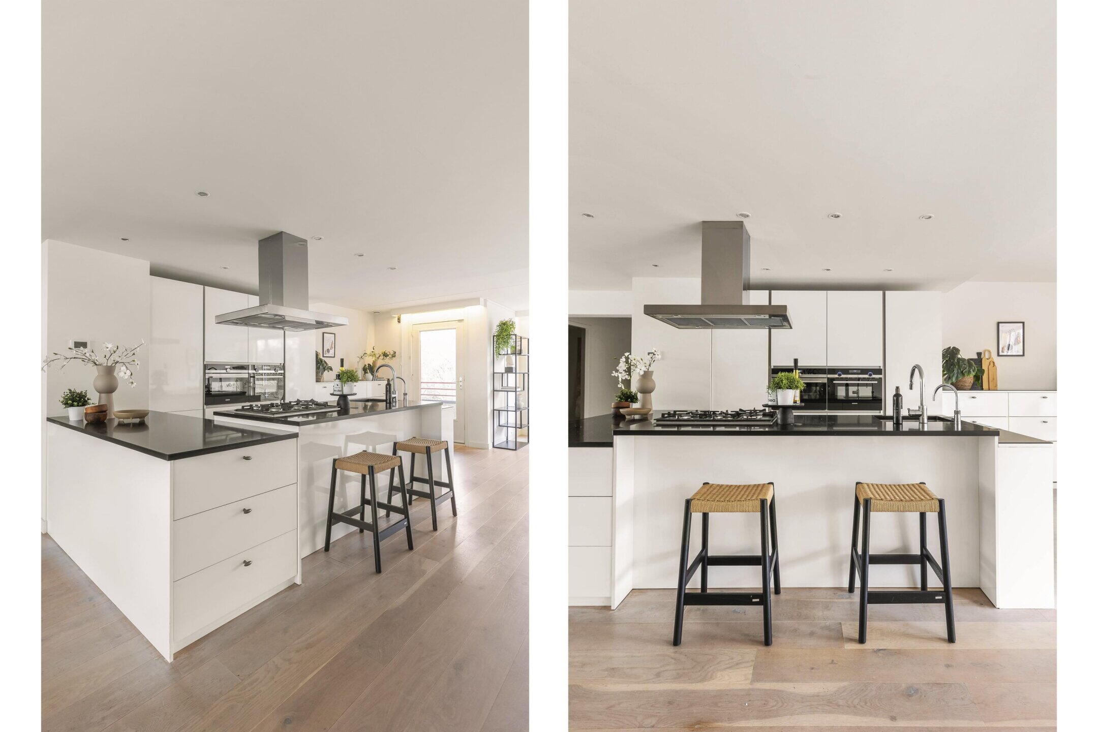 De indrukwekkende living strekt zich uit over de volledige breedte van het appartement en wordt gekenmerkt door grote raampartijen die zorgen voor een prachtige lichtinval en vrij uitzicht over het omliggende groen. De ruimte is royaal genoeg voor een comfortabele zithoek én een grote eettafel. Centraal in de leefruimte bevindt zich de moderne, U-vormige woonkeuken met kookeiland en gezellige ontbijtbar. De keuken is voorzien van diverse inbouwapparatuur (w.o. Quooker, vaatwasser en oven) en beschikt over meer dan voldoende opbergruimte.