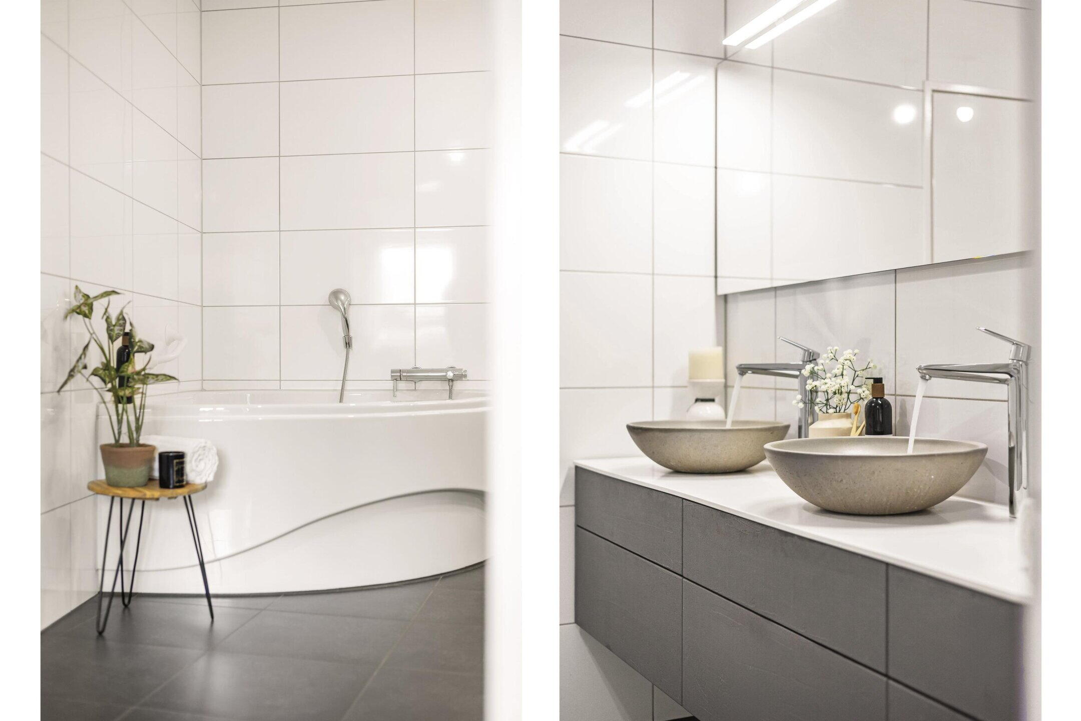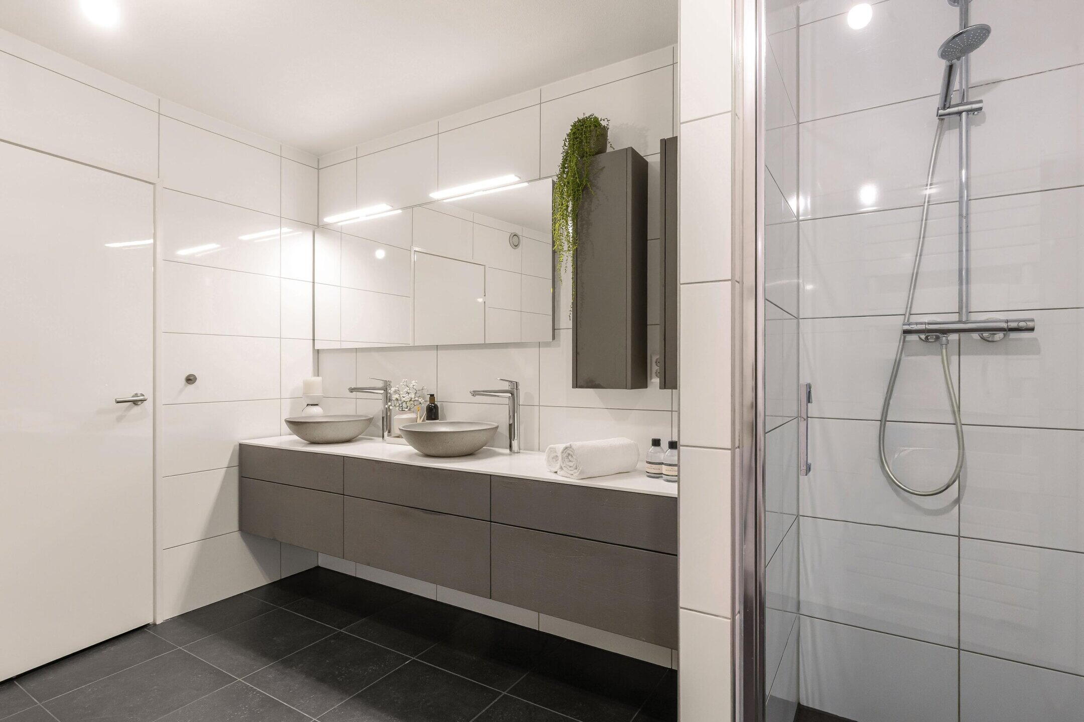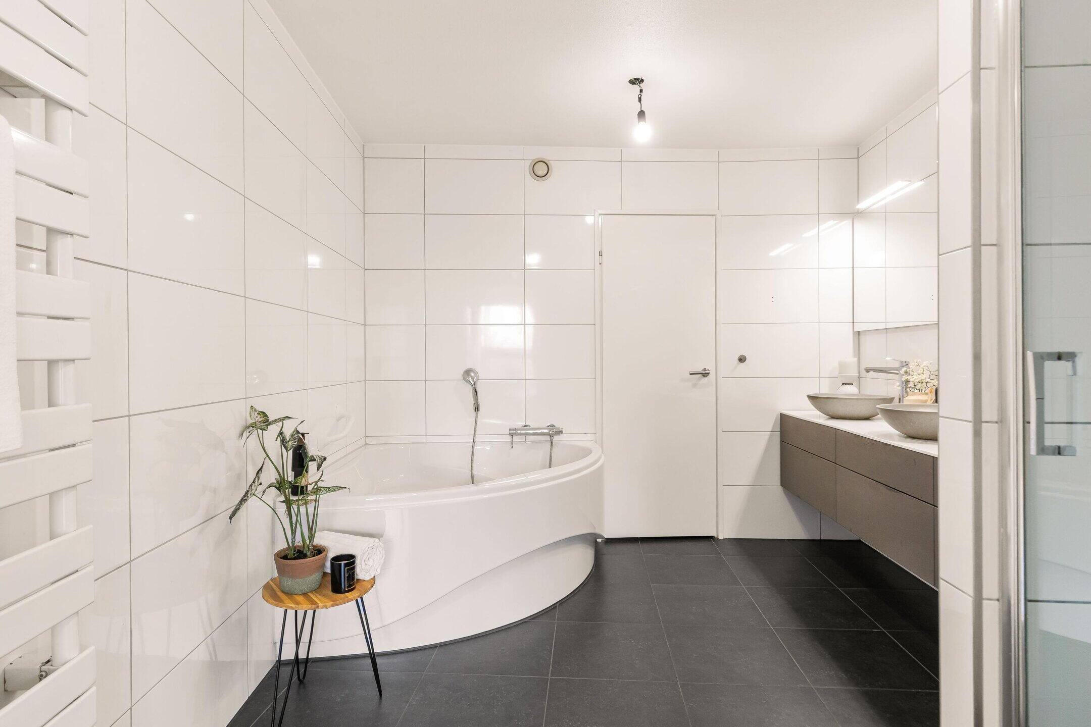 - Ligbad, toilet, dubbele wastafel, inloopdouche