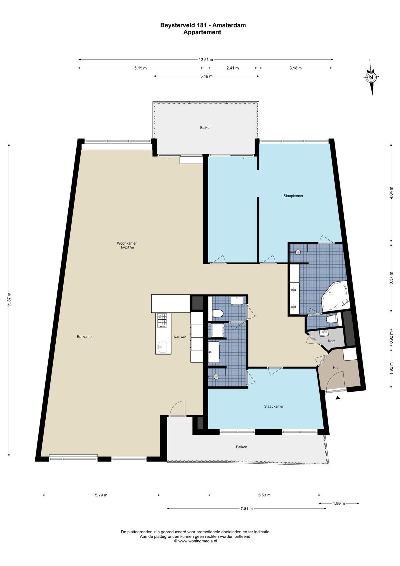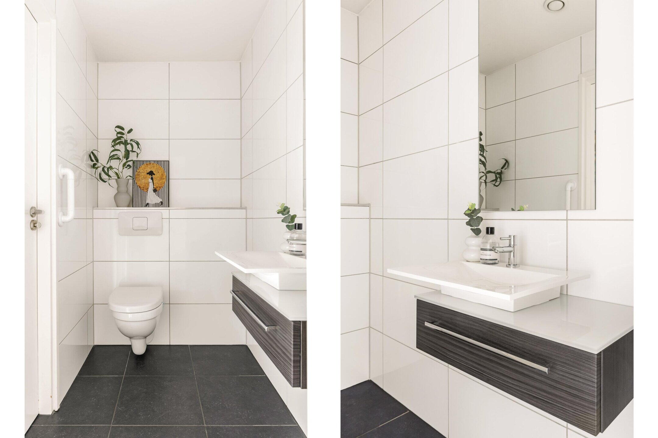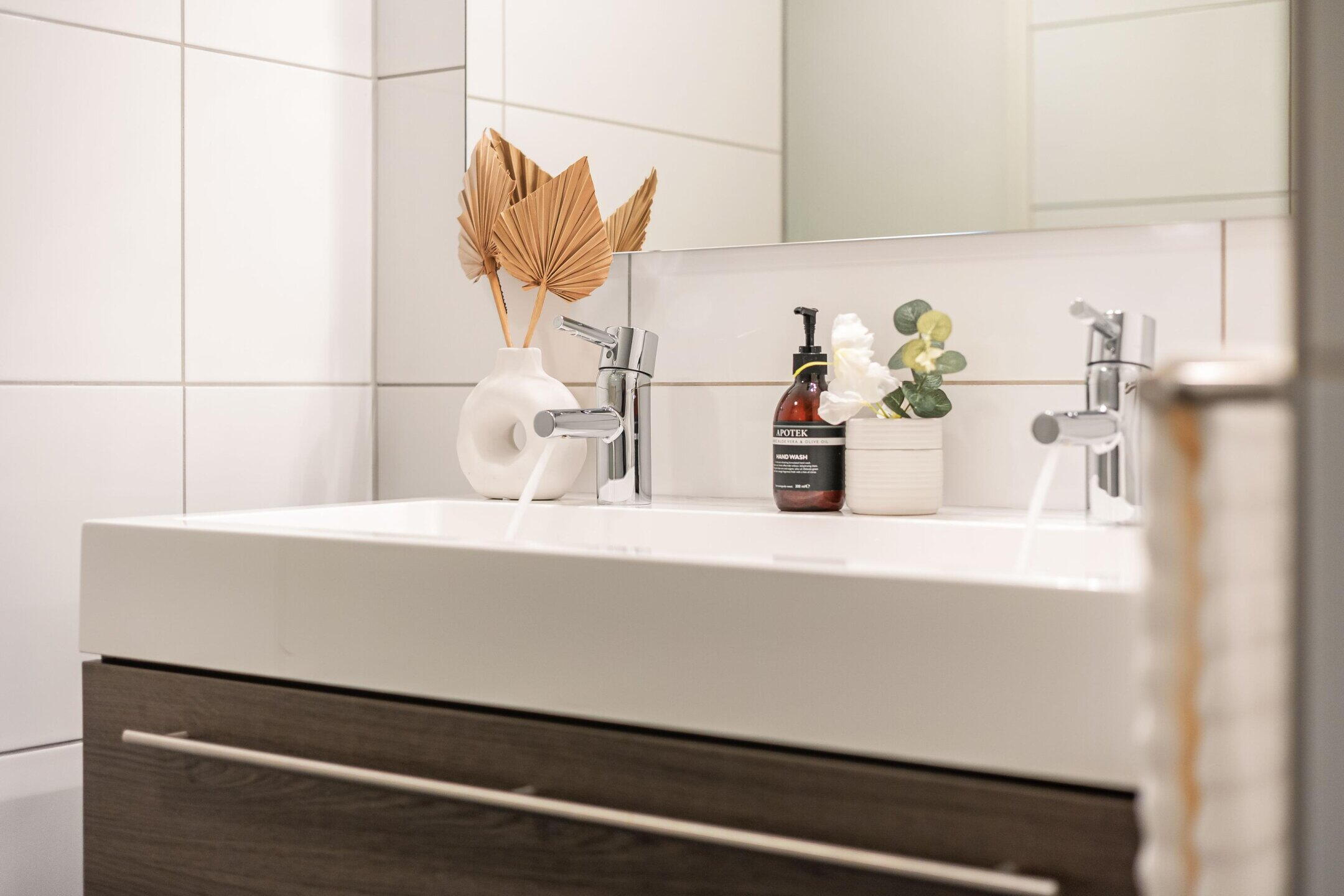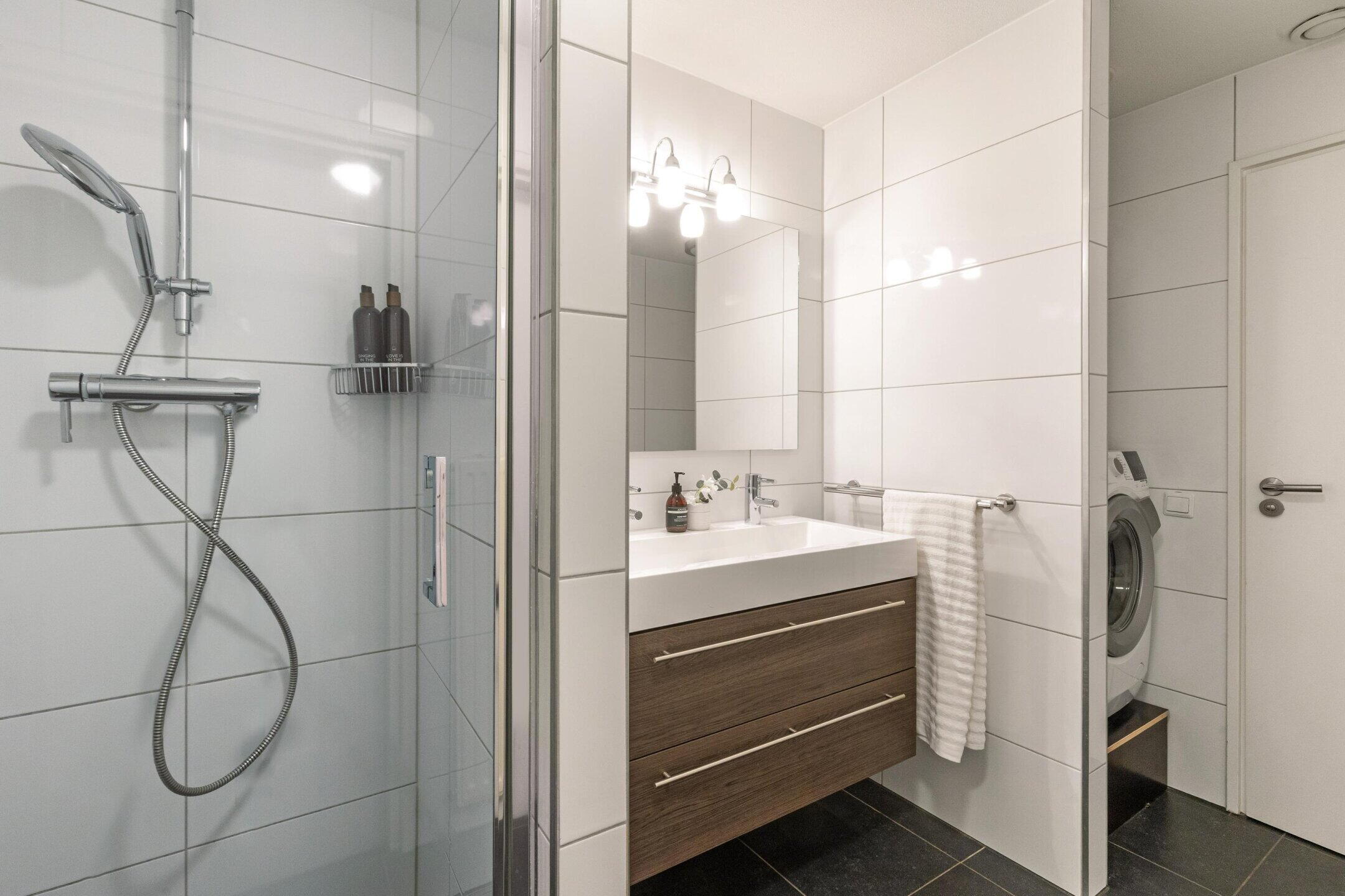 Het appartement telt 3 (slaap)kamers. De royale master bedroom heeft directe toegang tot de en suite badkamer, uitgevoerd in neutrale tinten en voorzien van een comfortabel ligbad, inloopdouche, toilet en dubbele wastafel. De tweede badkamer is eveneens modern afgewerkt en beschikt over een inloopdouche en wastafel. Hier bevindt zich de aansluiting voor de wasmachine en droger. Daarnaast is er een separaat toilet aanwezig en toegankelijk vanuit de hal bij binnenkomst.